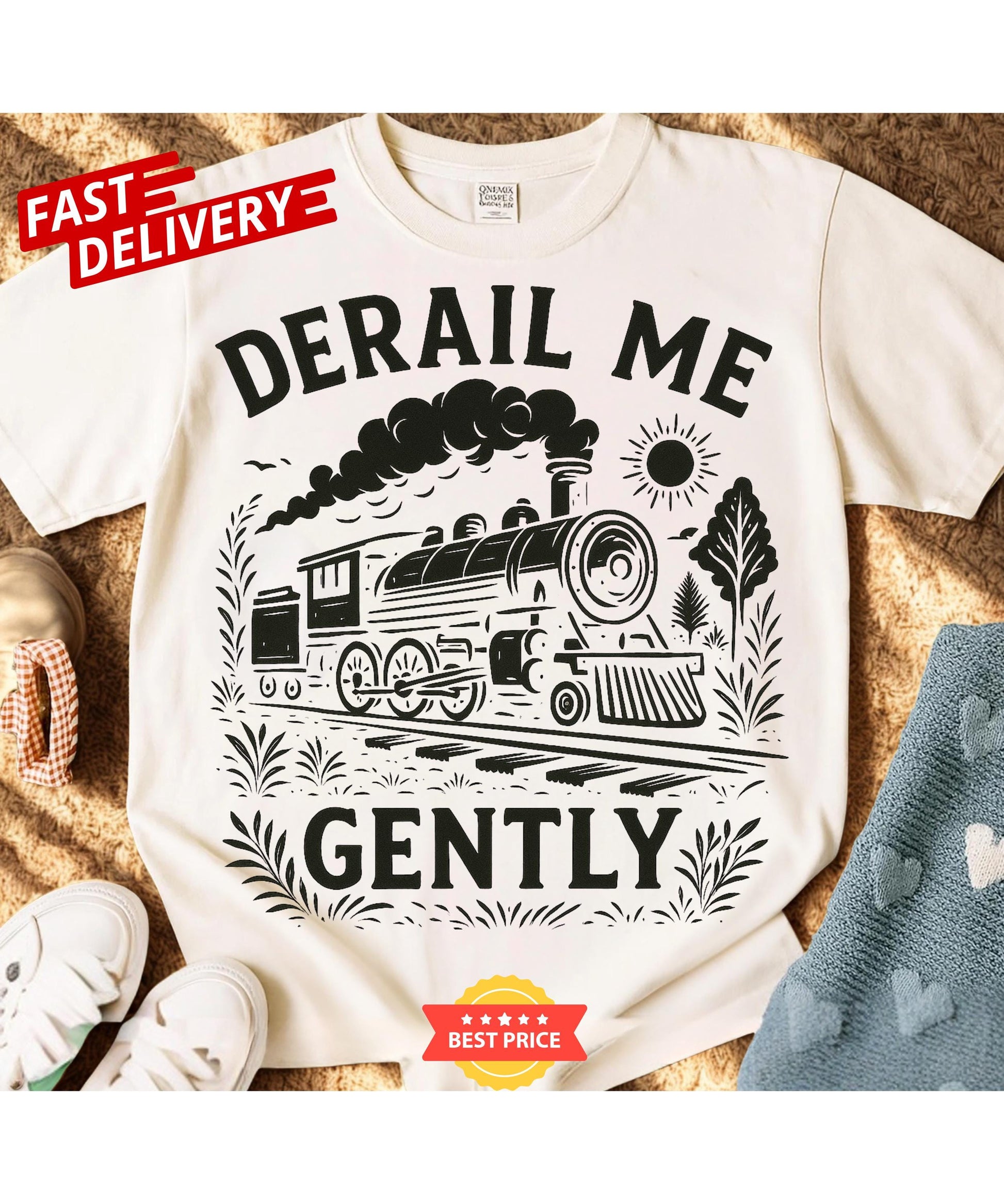 bold train t-shirt with derail me gently slogan, vintage locomotive art on unisex tee for quirky adults and alternative gift giving