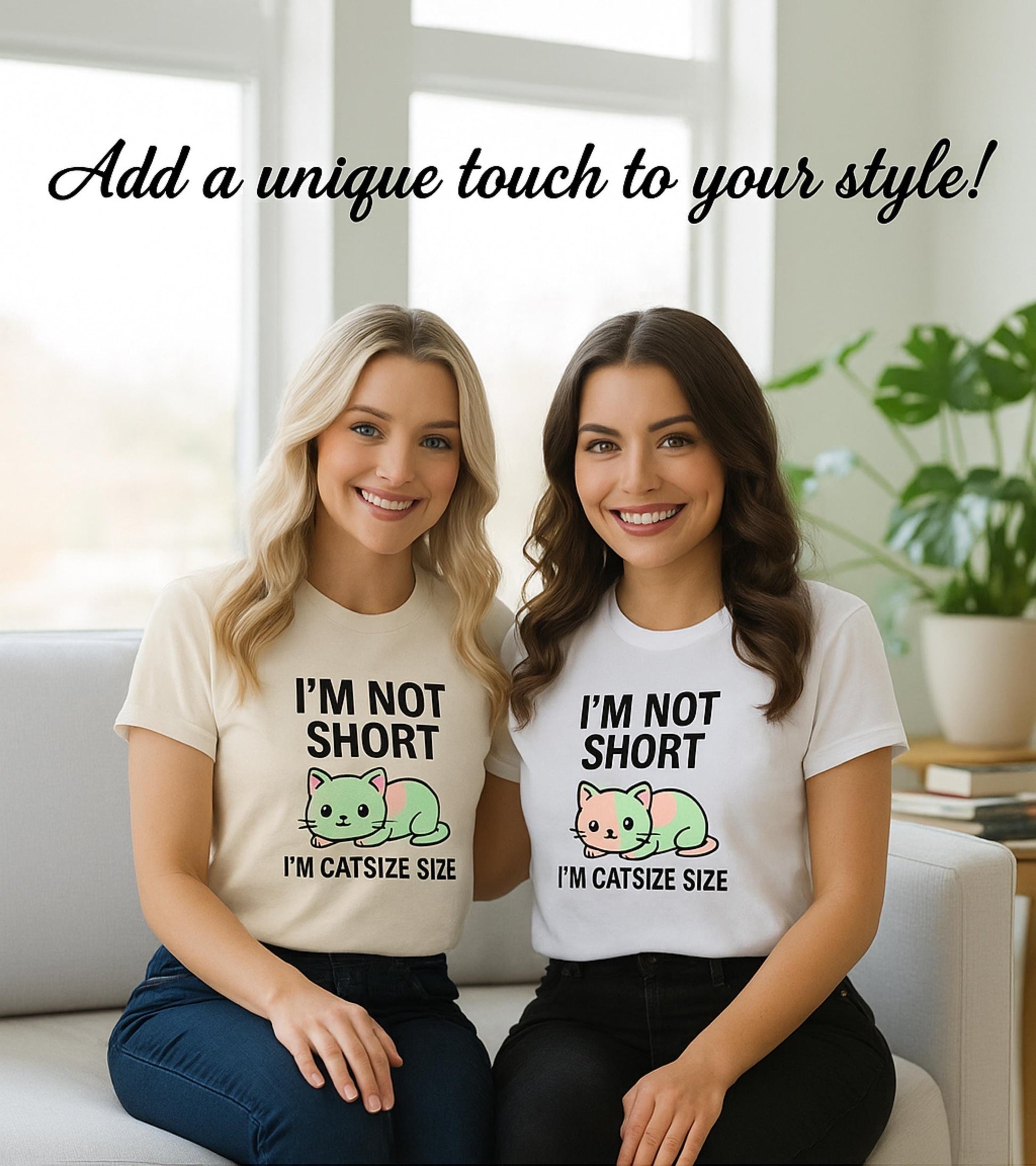 🐱 Funny Cat T Shirt — “I'm Not Short, I'm Catsize Size” slogan tee with pastel cartoon kitty design, perfect for humor lovers and cat fans 👕✨